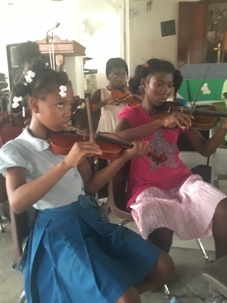 Day 3 of the music camp began rather smoothly, as many of the students were finished with their exams, so there was much less confusion. Helen, Paul, and Abby all branched out again to have small clinic’s with whoever was able to show up. However, the students seemed noticeably more motivated and excited this morning, as the final concert was scheduled for that evening. Students ran around in between exams and music lessons to prepare for the concert. Between the morning and afternoon rehearsal sessions, we American musicians, along with all 49 Haitian musicians were greeted with an enourmous feast, which was meant to be as a thank you/congratulations to all musicians for all of the hard work that happened in the previous days. The sheer amount of food that was prepared for 55 people to feast was nothing short of amazing. After a final rehearsal/sound check, students returned home to change and eat before the concert.